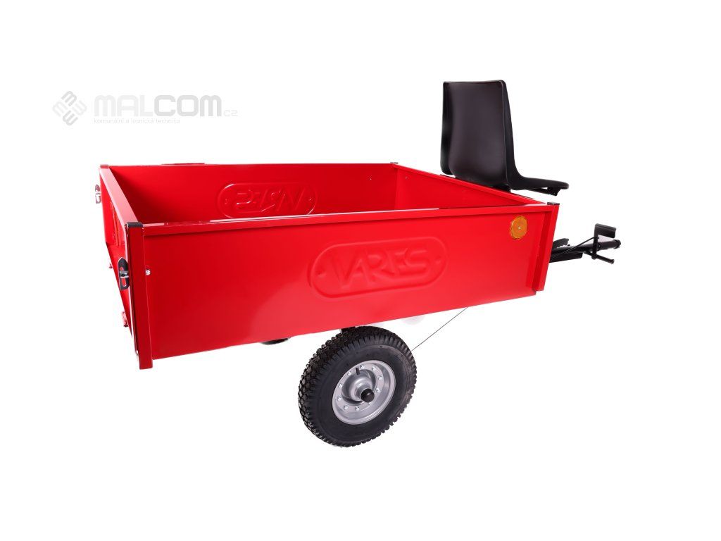 Vozík pro jednoosné malotraktory/kultivátory v lakovaném provedení s koly na ložiskách, ruční i nožní brzdou a sedadlem pro řidiče.